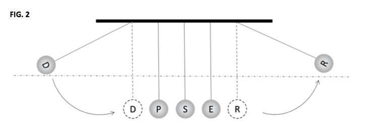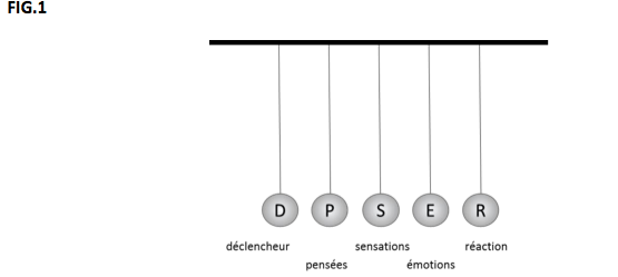 Ceci étant, lorsqu’il se passe quelque chose dans notre environnement et que nous le percevons (stimulus ou déclencheur) nous avons pour habitude de réagir de manière plus ou moins automatique. Avez-vous déjà réfléchi comment se construit cette réaction ? Je vous propose d’utiliser la métaphore du pendule de Newton pour illustrer notre propos. (Fig 1.)