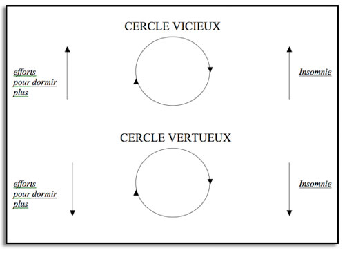 Il s’agit ici de rechercher les cercles vicieux qui nourrissent l’insomnie de Léonie. Quelle que soit son origine, l’insomnie tourne à présent toute seule. Parfois, l’insomnie se réduit toute entière à ces cercles vicieux, on la baptise alors insomnie psychophysiologique ou encore insomnie de conditionnement. Mais dans tous les cas, dès lors que l’insomnie de Léonie s’est chronifiée, elle s’auto-entretient par les efforts fournis par Léonie pour essayer de mieux dormir !