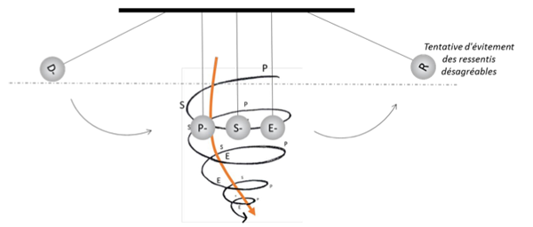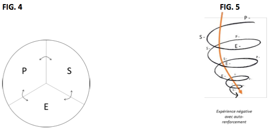 Percevez-vous que les sensations, pensées et émotions s’activent et se mettent à tourner ensemble comme dans un manège pernicieux (fig. 4) qui s’enfonce irrémédiablement dans une expérience de plus en plus « désagréable ». Indépendamment de l’intensité de ce tourbillon, dans pareille situation, on se dit des choses, on en ressent d’autres et cela nous met dans une émotion à propos de laquelle on ressent d’autres choses, souvent pires, et ainsi de suite... (fig. 5)