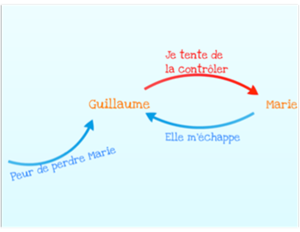 Guillaume consulte pour ses relations extrêmement détériorées avec son épouse. Oui, nous pouvons l’aider en concrétisant ce qui pose problème, en dessinant ce problème, il prend conscience que plus il tente de savoir tout ce qu’elle fait, plus il vérifie son agenda et lui pose des questions sur qui elle voit et plus elle lui échappe, elle ne parle pas de ce déjeuner avec un collègue un peu trop beau gosse aux yeux de Guillaume. Et il devient fou quand il l’apprend par le biais d’un ami… [1]