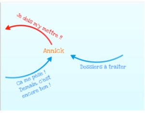 Très régulièrement, elle postpose et si un client l’appelle, elle dit qu’elle attend une réponse de la partie adverse, même si elle n’a pas fait son boulot. Elle arrive au bureau et passe beaucoup de temps sur ses mails ou sur internet, va boire un café et ne parvient vraiment pas à s’y mettre. Elle procrastine.